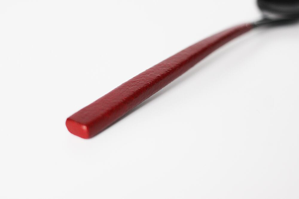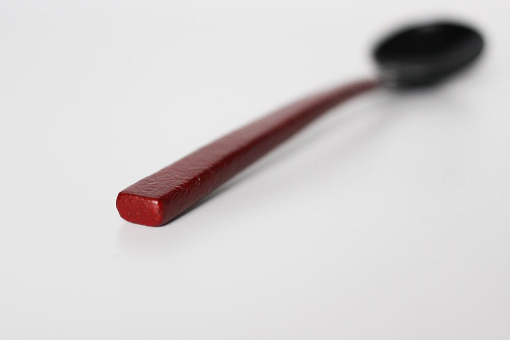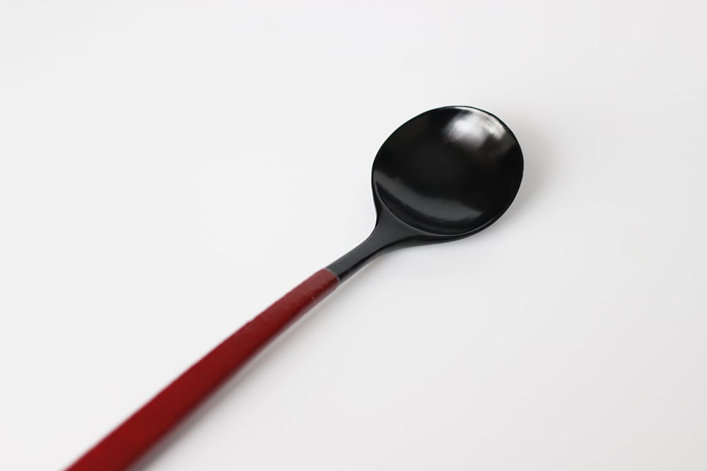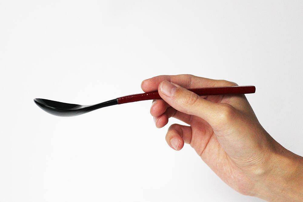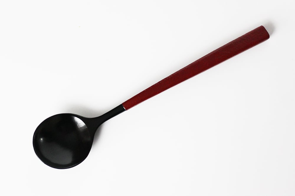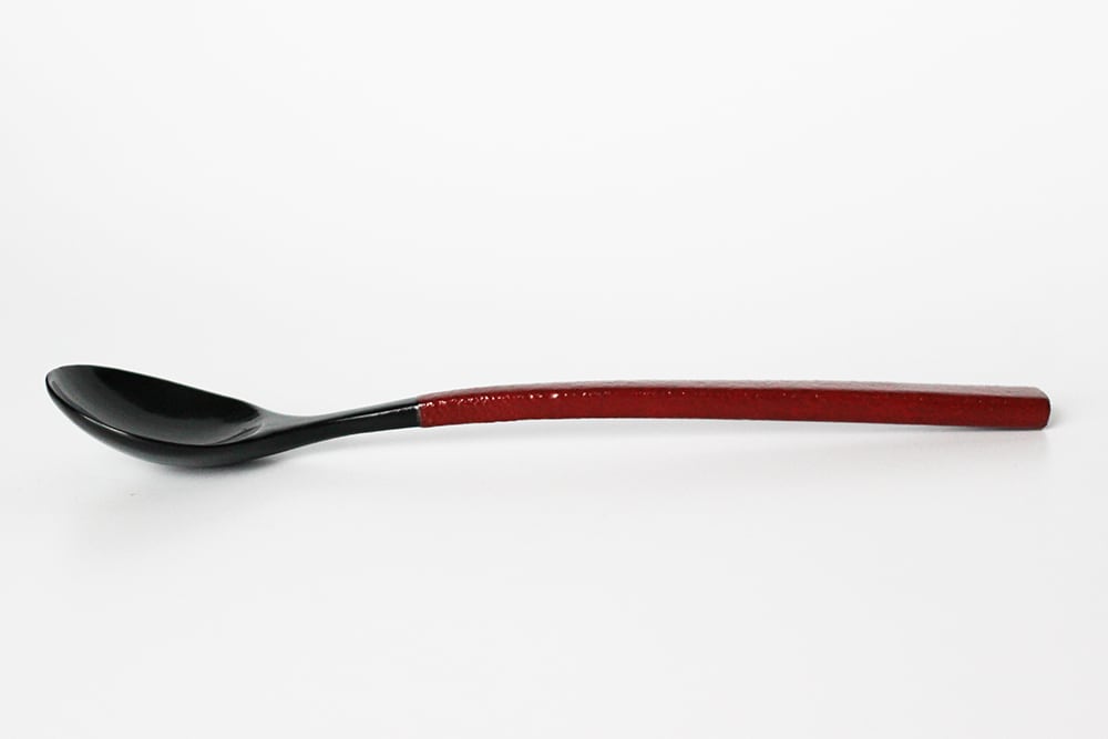 柄の部分に乾漆粉を蒔き、滑り止めとしっとり感を両立させた総漆塗りのスプーンです。