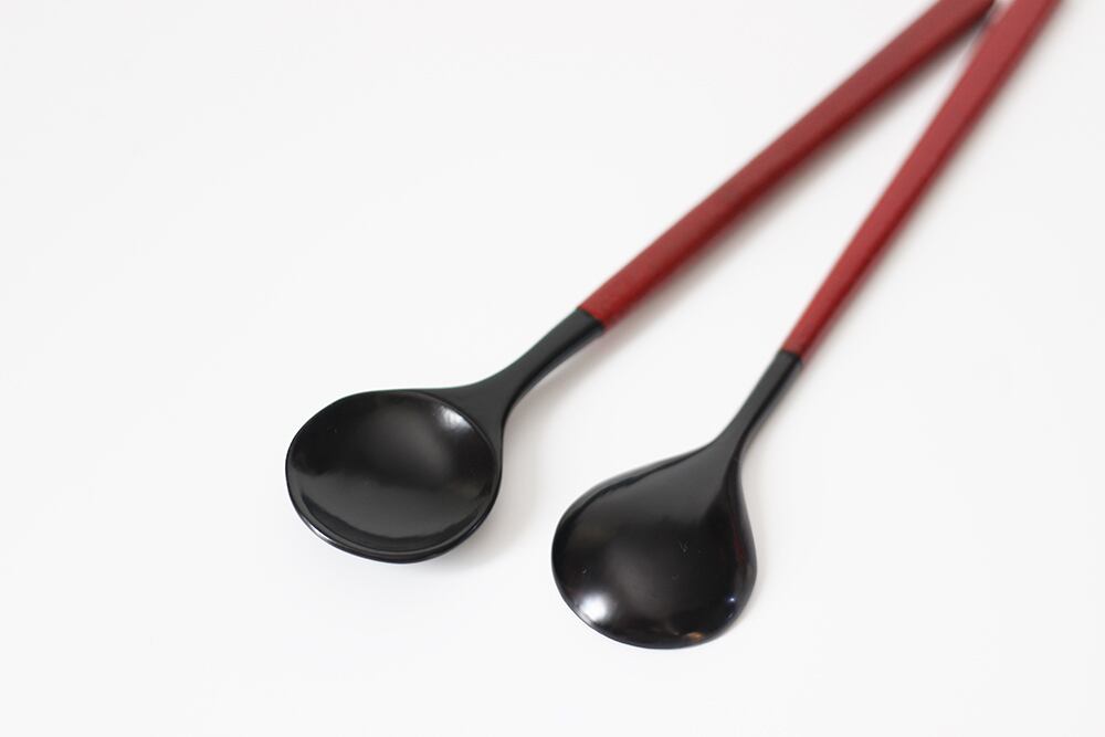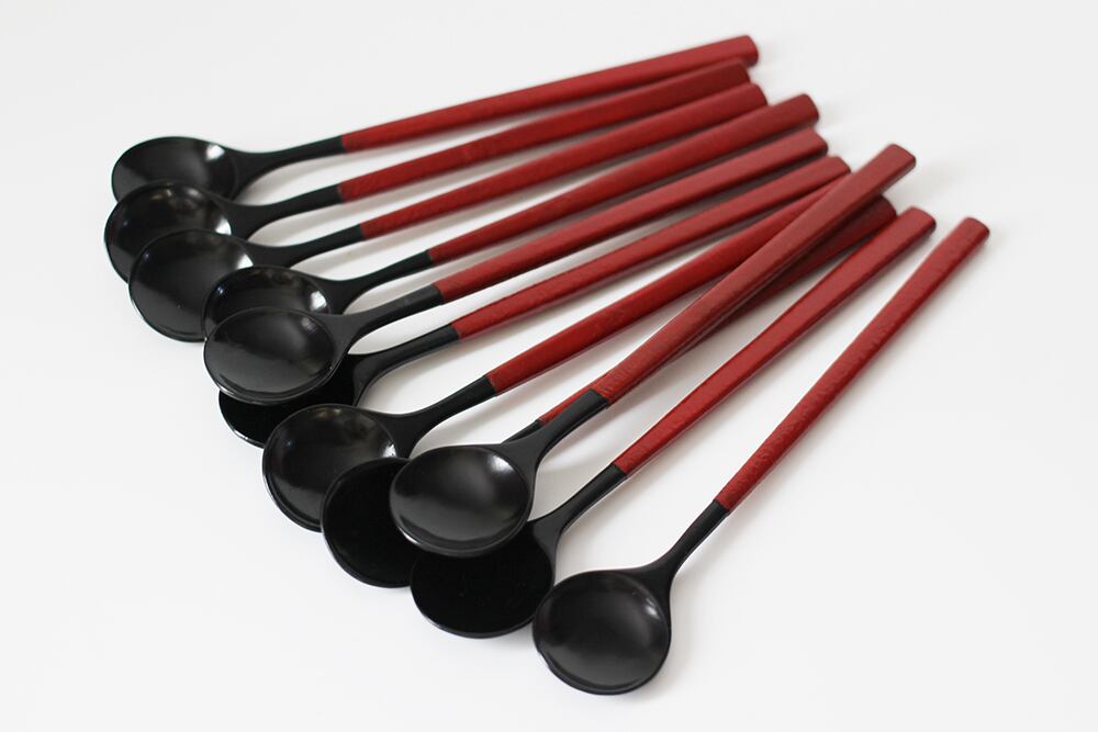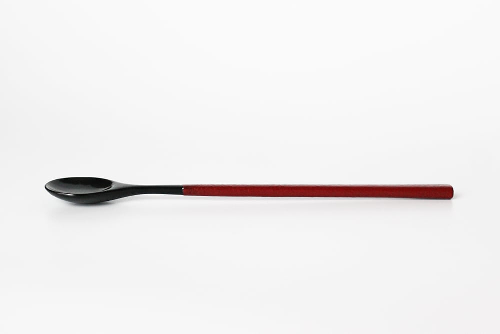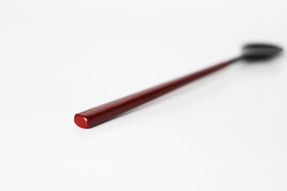柄の部分に乾漆粉を蒔き、滑り止めとしっとり感を両立させた総漆塗りのスプーンです。