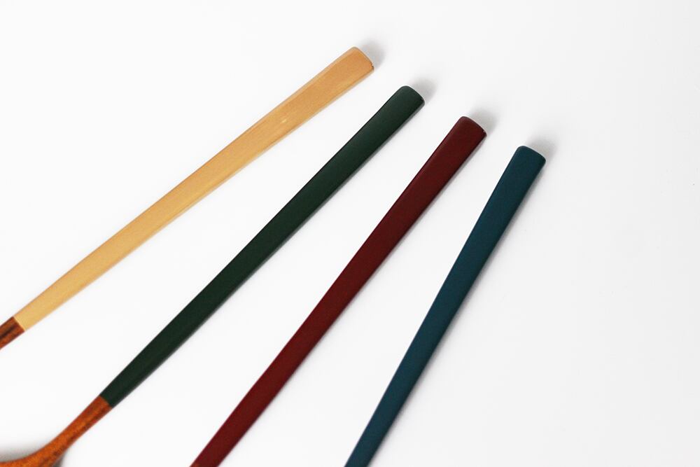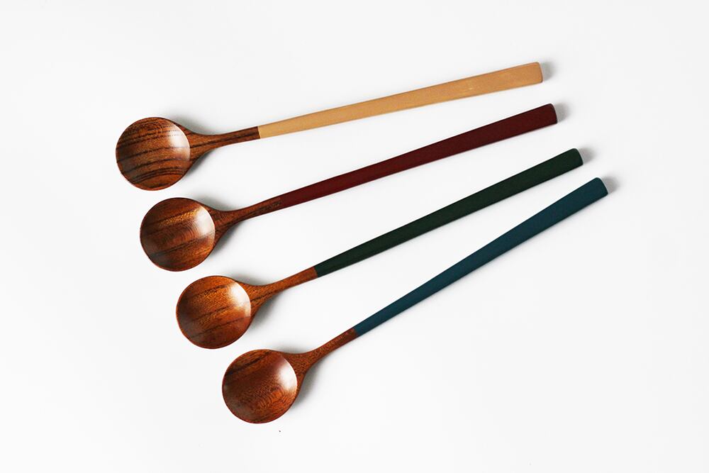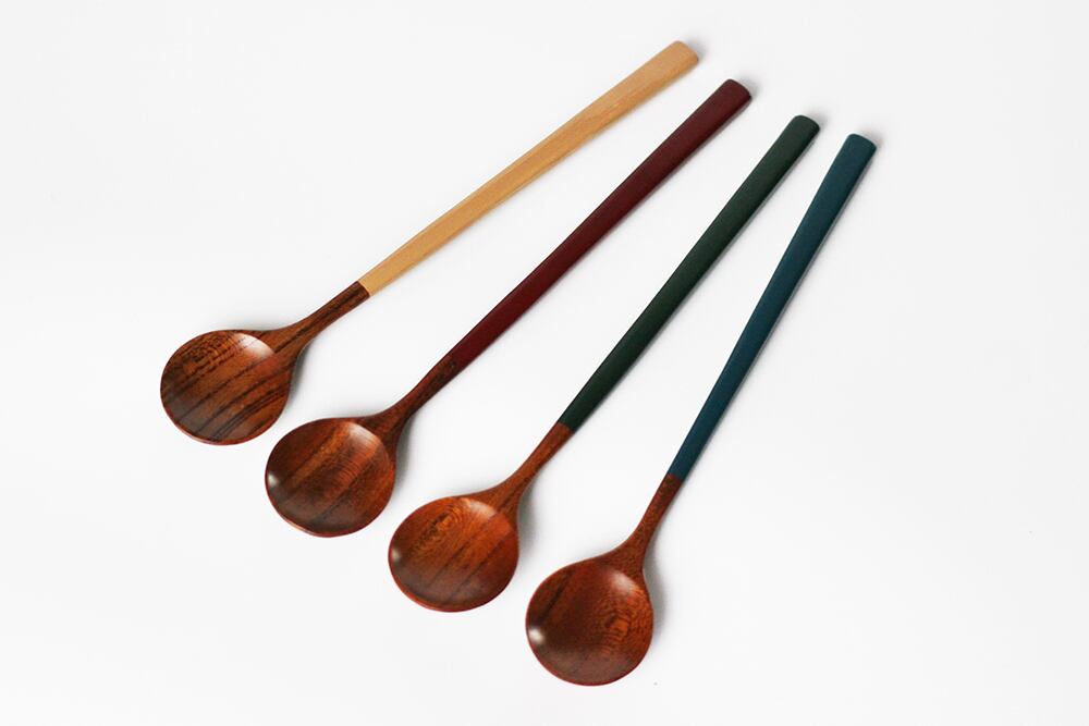 全体に拭き漆を施し、柄の部分に漆を3回塗り重ねたデザートスプーンです。